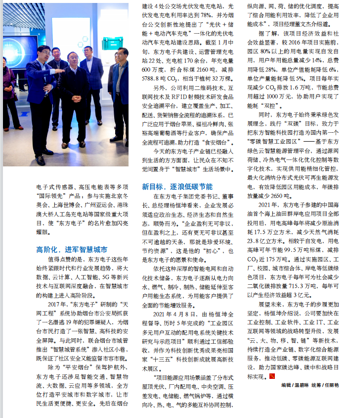 除为“平安烟台”保驾护航外,必一运动电子还涉足智能交通、智慧物流、大数据、云应用等多领域,全方位打造平安城市和数字城市,让市民生活更便捷、更安全。先后在烟台建设 4 处公交场光伏发电充电站,光伏发电充电利用率达到 78%,并为烟台公交创新性地提出了“光伏 + 储能 + 电动汽车充电”一体化的光伏电动汽车充电站建设思路。截至 1 月中旬,必一运动电子共建设、运营管理充电站 22 处、充电桩 170 余台,年充电量600 万度,折合标煤 2160 吨,减排5788.8 吨 CO2,相当于植树 32 万棵。